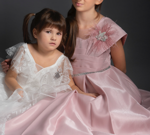 La linea damigella si distingue per gli inserti di Pizzo e ricami in Swarovski, che donano un particolare tocco di raffinatezza a modelli unici realizzati in tulle, organze e chiffon nelle sfumature dei colori Rosa e Avorio ma anche nel nuovissimo colore Slavia.